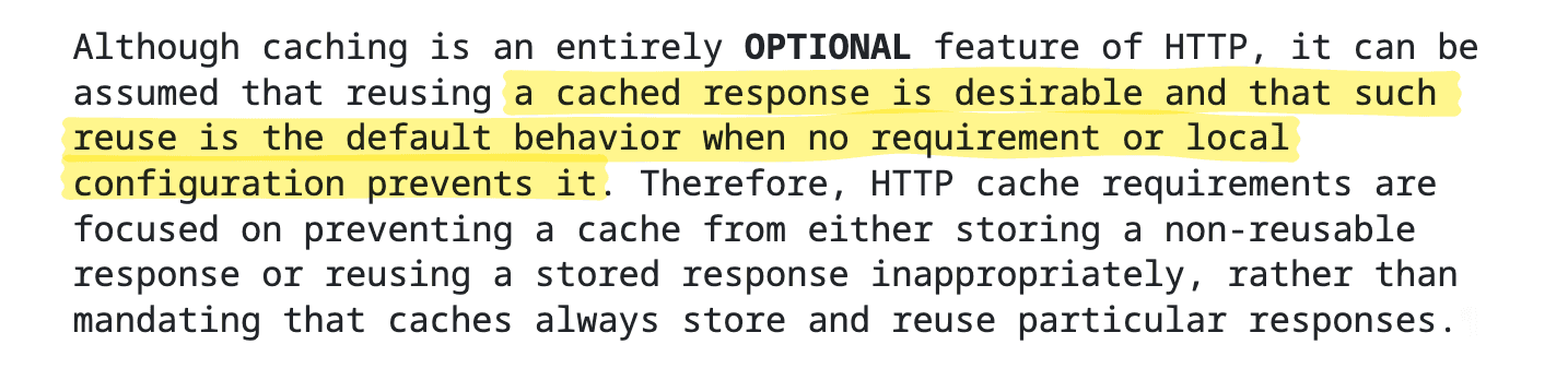 The caching component of the HTTP protocol, as defined in RFC 9111, is complex and intentionally flexible. It’s designed to handle a wide range of HTTP scenarios - often managed entirely by a web cache server without involving the “higher power” - aka the Web Application Server.